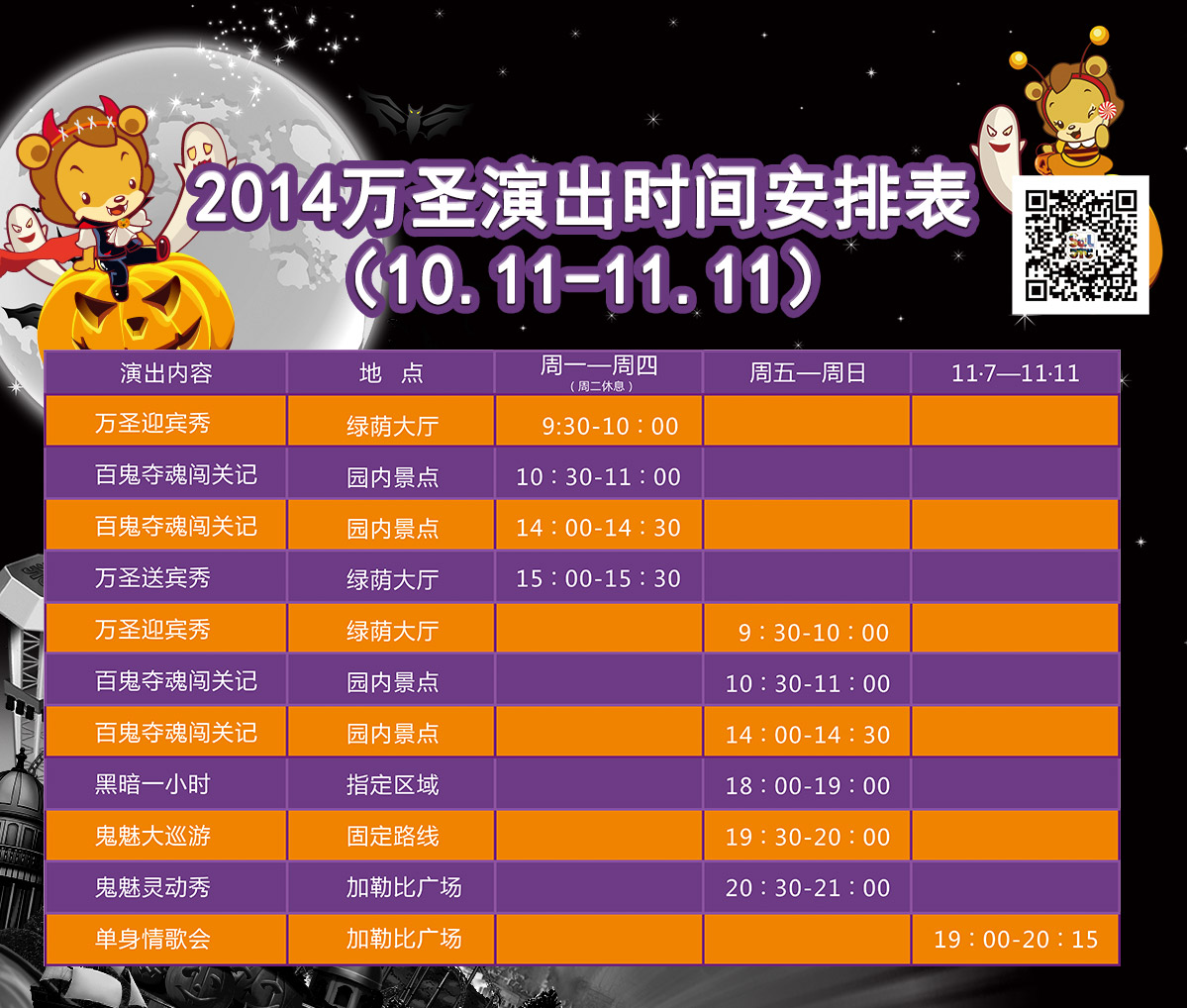 百鬼出没游乐园,万圣月期间,穿着惊悚恐怖的中西方鬼怪在乐园中穿梭游走,再加上鬼魅花车的点缀,万圣恐怖气息异常浓郁。"鬼怪们"定时下车与游客互动合影,你敢来吗!?